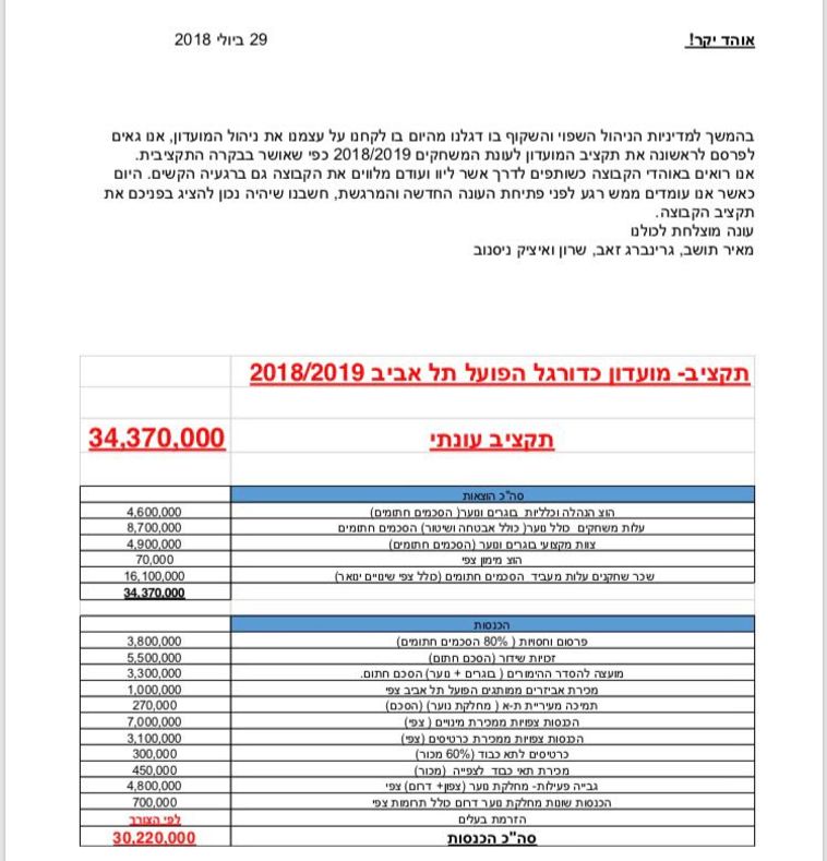 תקציב הפועל תל אביב לעונת 2018/19 (צילום: הפועל תל אביב)